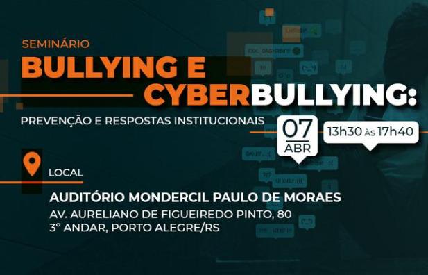 O Ministério Público do Rio Grande do Sul (MPRS), por iniciativa do Centro de Apoio Operacional da Educação, Infância e Juventude (CAOEIJ) e por intermédio do Centro de Estudos e Aperfeiçoamento Funcional (CEAF), promove, na próxima terça-feira, 7 de abril, o Seminário “Bullying e Cyberbullying: Prevenção e Respostas Institucionais”. A atividade ocorre das 13h30 às 17h40, no Auditório Mondercil Paulo de Moraes, na sede institucional do MPRS, em Porto Alegre, com transmissão ao vivo pelo <b><...