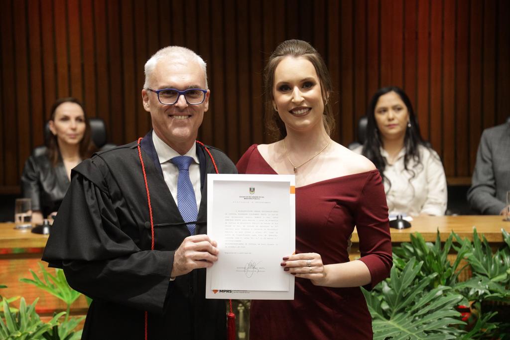 A nova promotora de Justiça Virgínia Lupatini, segunda colocada no concurso, fez o juramento oficial. Logo depois, a coordenadora da Secretaria dos Órgãos Colegiados, promotora-assessora Juliana Bossardi, fez a leitura do termo de posse, assinado pelos novos membros do Ministério Público gaúcho.