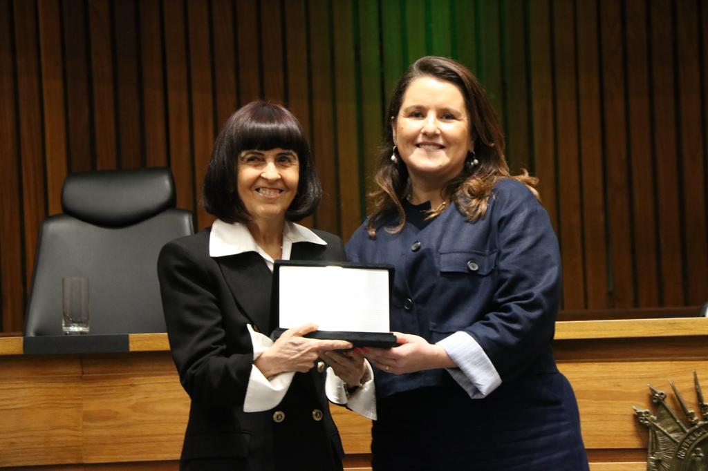 Reconhecida por sua atuação incansável na área da infância e juventude, Maria Regina recebeu uma placa em reconhecimento ao trabalho desenvolvido ao longo dos anos, que contribuiu significativamente para o fortalecimento da rede de proteção e para a formação de novas gerações de promotores e promotoras de Justiça.