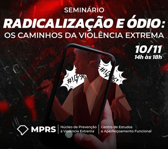 Na próxima segunda-feira, 10 de novembro, das 14h às 18h, o Ministério Público do Rio Grande do Sul (MPRS) realiza o seminário “Radicalização e ódio: os caminhos da violência extrema”, no auditório do Centro de Estudos e Aperfeiçoamento Funcional (CEAF) da instituição, em Porto Alegre.