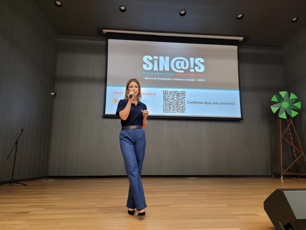 Durante a atividade, a promotora de Justiça Manuela Paradeda Montanari, integrante do NUPVE, apresentou os principais fatores que levam adolescentes e jovens a se envolverem em atos de violência extrema — tanto contra si mesmos quanto contra terceiros. Foram abordados aspectos como o contexto familiar e social que favorece a vulnerabilidade, a influência de grupos virtuais que promovem a radicalização, as plataformas digitais utilizadas para esse contato e os tipos de violência praticados, destacando que os próprios autores também são vítimas desse cenário.