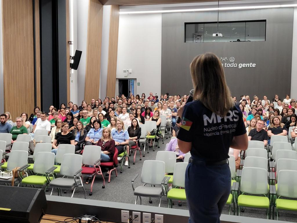 Mais de 200 profissionais das áreas da Educação, Assistência Social, Saúde e Segurança Pública dos municípios da Comarca de Ijuí participaram, na terça-feira, 4 de novembro, de uma capacitação promovida pela Promotoria de Justiça Especializada de Ijuí. O encontro foi realizado no Centro Administrativo do Sicredi, e teve como foco o Projeto Sin@is, desenvolvido pelo Núcleo de Prevenção à Violência Extrema (NUPVE) do Ministério Público do Rio Grande do Sul (MPRS).
