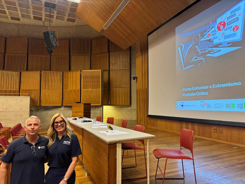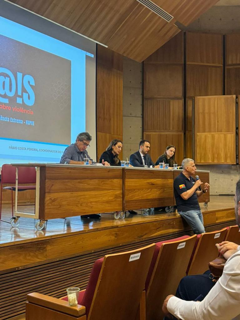 Já Michele Prado, assessora do NUPVE, integrou o painel “Perspectivas Acadêmicas sobre o Extremismo Violento Online”, trazendo contribuições sobre pesquisas e análises relacionadas ao tema.