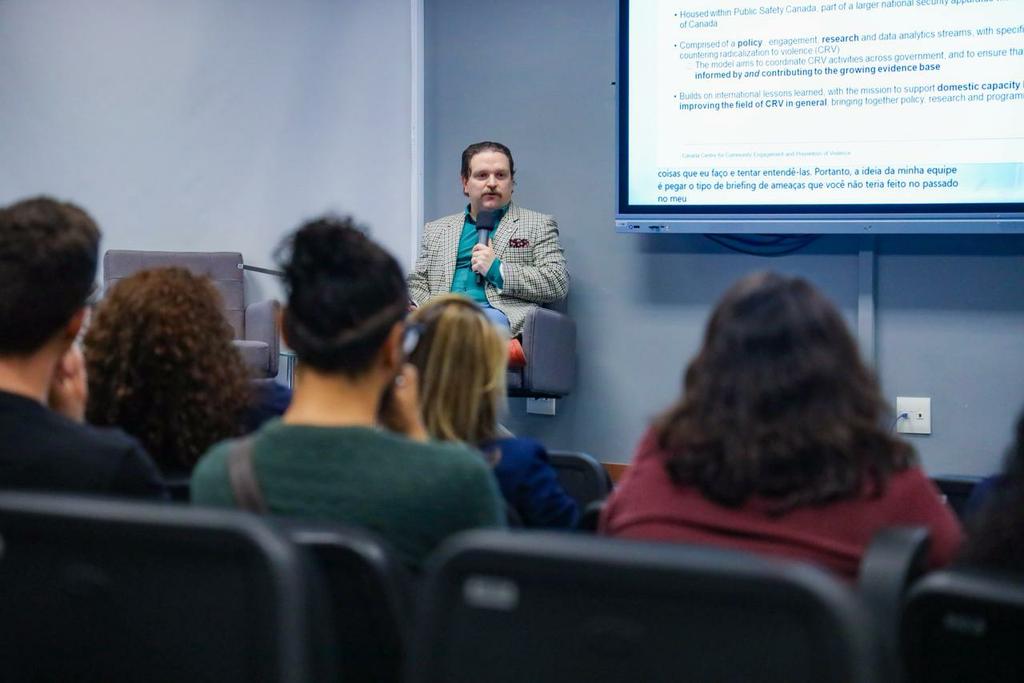 O destaque da programação foi a palestra do pesquisador canadense Marc-André Argentino, referência internacional no estudo de extremismo violento e integrante do Canada Centre for Community Engagement and Prevention of Violence – Public Safety Canada. Argentino é reconhecido por suas pesquisas sobre movimentos conspiratórios e extremistas digitais, como o QAnon, que combinam crenças apocalípticas, teorias da conspiração e discursos messiânicos, criando comunidades altamente engajadas e suscetíveis à radicalização.