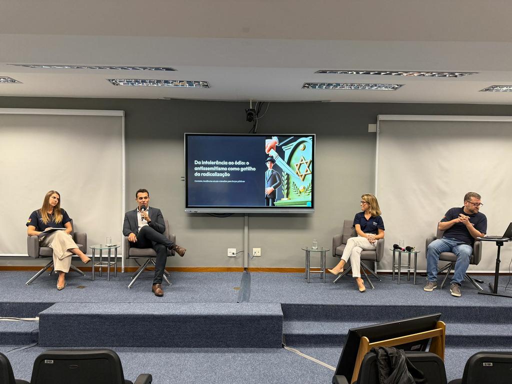 Outro momento importante do seminário foi a mesa “Da intolerância ao ódio: o antissemitismo como gatilho de radicalização”, conduzida por Leonardo Moser Vissoky, gerente de segurança da Federação Israelita do Rio Grande do Sul.
