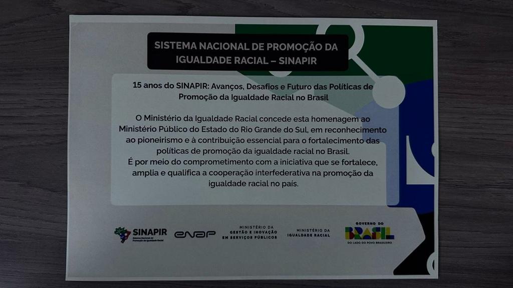 O Ministério Público do Rio Grande do Sul (MPRS) foi homenageado nesta segunda-feira, 8 de dezembro, durante a celebração dos 15 anos do Sistema Nacional de Promoção da Igualdade Racial (SINAPIR). O reconhecimento ocorreu no seminário “Avanços, Desafios e Futuro das Políticas de Igualdade Racial”, realizado na Escola Nacional de Administração Pública (ENAP), em Brasília.