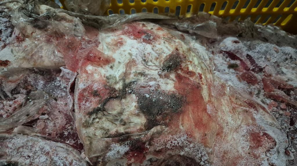Nos contêineres e áreas internas do supermercado foram identificados produtos de origem animal em condições completamente inadequadas para o consumo humano, incluindo carnes bovina, suína, ovina, de frango, miúdos de frango e bovinos, bacon, hambúrgueres e diversos tipos de pescados. As equipes encontraram toneladas de itens vencidos, sem procedência, mal acondicionados, com embalagens primárias abertas ou preservados em temperaturas incompatíveis com as indicadas pelo fabricante. Muitos dos produtos apresentavam aspecto, cor e odor repugnantes, forte indicativo de deterioração ou contaminação. Também foram identificadas caixas plásticas totalmente sujas, mau estado de conservação dos equipamentos e forte odor de esgoto na área externa onde estavam instalados os contêineres.