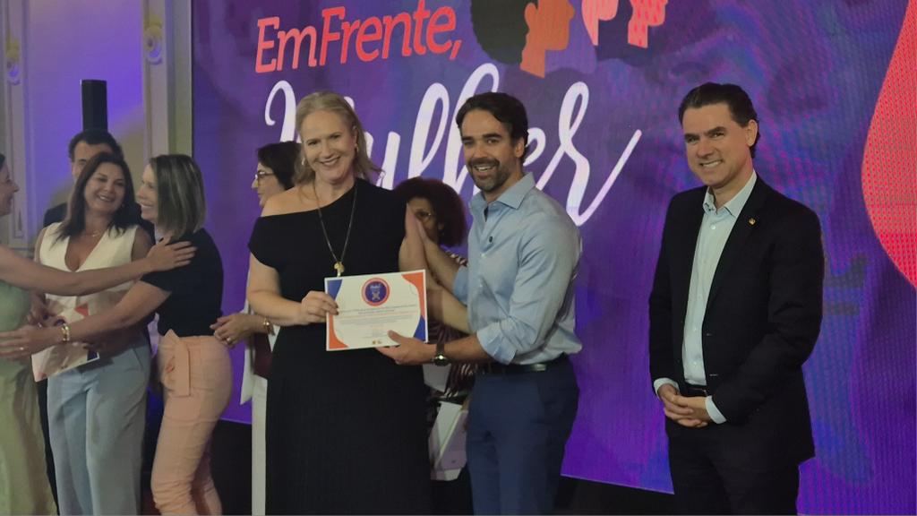 O Ministério Público do Rio Grande do Sul (MPRS) recebeu, nesta quarta-feira, 4 de março, o certificado do Selo “EmFrente, Mulher”, entregue pelo governador Eduardo Leite. O selo foi concedido a 28 instituições e empresas gaúchas selecionadas na edição de 2025 que desenvolvem, de forma permanente e estruturada, programas, projetos e ações voltados à valorização das mulheres e ao enfrentamento da violência de gênero. O selo foi recebido pela coordenadora do Centro de Apoio Operacional de Enfrentamento à Violência Contra a Mulher, Ivana Battaglin, que esteve na cerimônia, ocorrida no Palácio Piratini, juntamente com o procurador-geral de Justiça, Alexandre Saltz.