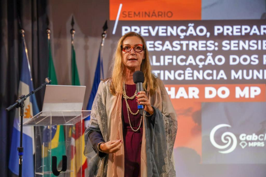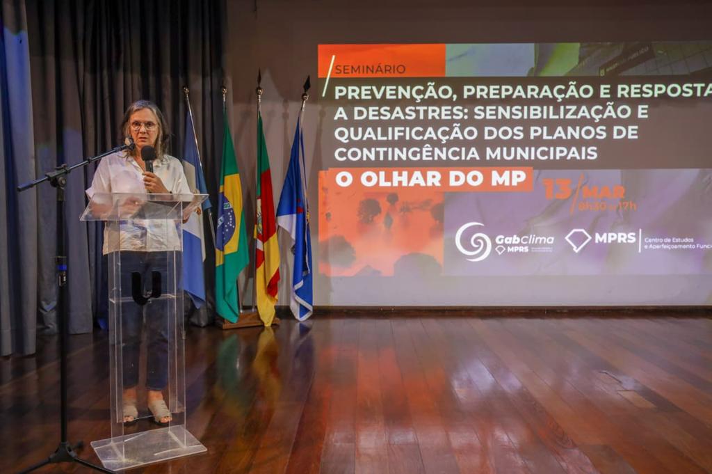 Em nome da Administração Superior do MPRS, a subprocuradora-geral de Justiça para Assuntos Jurídicos, Josiane Superti Brasil Camejo, ressaltou que “os eventos climáticos extremos deixaram de ser previsões distantes para se tornarem realidades que batem à nossa porta, testando nossa infraestrutura e, tragicamente, a segurança das nossas famílias”. Para ela, o seminário representa o MPRS estendendo a mão aos municípios para que a resposta ao desastre não seja o improviso, mas sim o resultado de um planejamento técnico rigoroso. “O Rio Grande do Sul tem uma história de superação, mas a nossa meta agora é a antecipação”, disse.