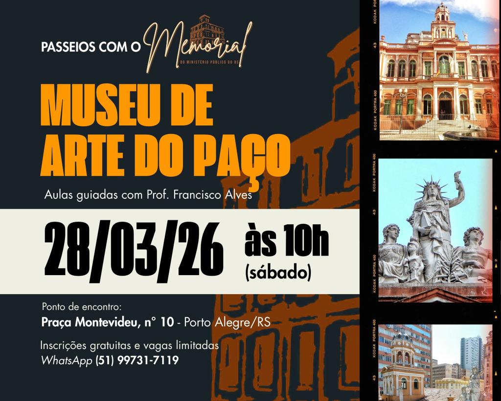 O Memorial do Ministério Público do Rio Grande do Sul (MPRS) realiza neste sábado, 28 de março, às 10h, mais uma caminhada orientada pelo professor de História da Arte José Francisco Alves, autor do livro “A Escultura Pública de Porto Alegre”. O roteiro se concentrará no Paço dos Açorianos e na Praça Montevidéu. O Paço é o primeiro palácio das belas artes do Rio Grande do Sul e sedia o Museu de Arte do Paço, que recebe exposições coletivas, individuais e guarda um dos acervos de arte da prefeitura, a Pinacoteca Aldo Locatelli.