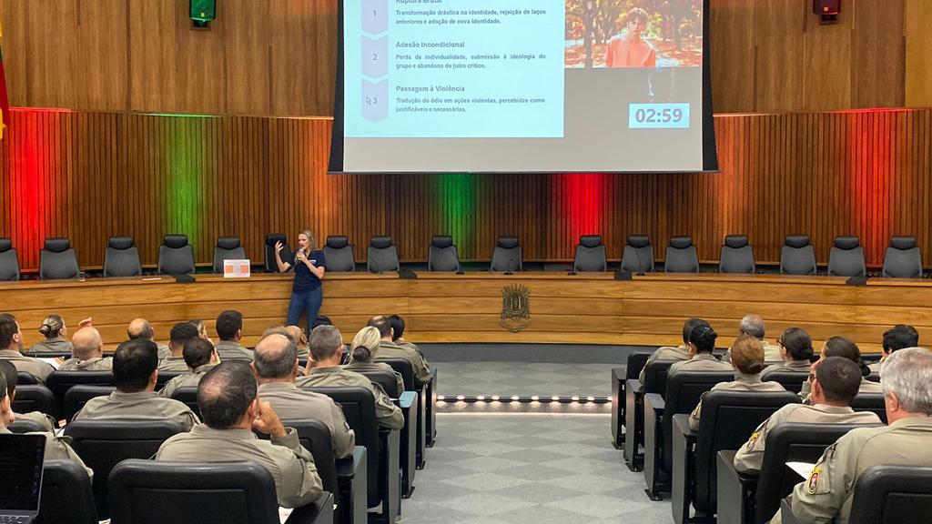 O Ministério Público do Rio Grande do Sul (MPRS), por meio do Núcleo de Prevenção à Violência Extrema (NUPVE), realizou, nesta quarta-feira, 8 de abril, a Capacitação do Projeto Sinais para cerca de 500 policiais militares de todo o Estado. A atividade ocorreu na sede institucional do MPRS, em Porto Alegre.
