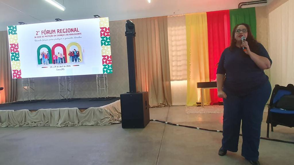 A promotora de Justiça Aline Beatriz Bibiano, da Promotoria de Casca, acompanhou o evento, destacando a relevância do debate e da qualificação contínua dos profissionais que atuam diretamente na garantia de direitos de crianças e adolescentes.