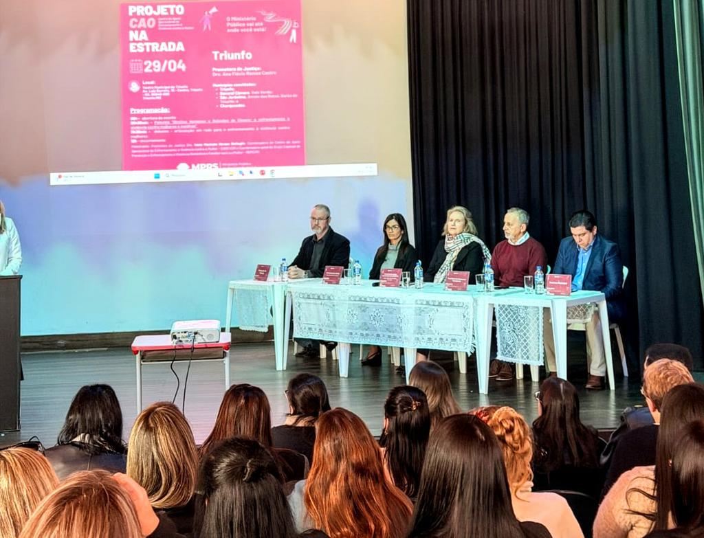 O Ministério Público do Rio Grande do Sul (MPRS) realizou, nesta quarta-feira, 29 de abril, no Teatro Municipal de Triunfo, mais uma edição do Projeto CAO na Estrada, iniciativa do Centro de Apoio Operacional de Enfrentamento à Violência contra a Mulher (CAOEVCM). A atividade teve como foco a articulação da rede de proteção, a capacitação de agentes públicos e a sensibilização sobre direitos humanos e relações de gênero no enfrentamento à violência contra mulheres e meninas.