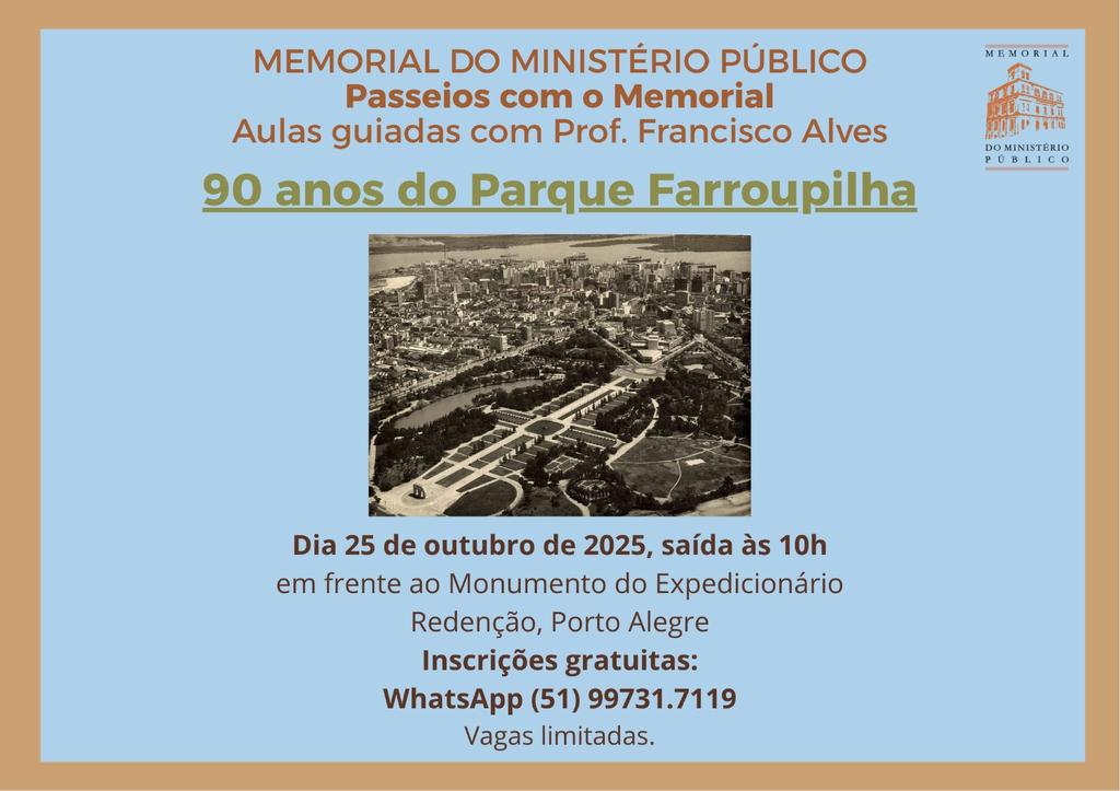 O Memorial do Ministério Público do Rio Grande do Sul (MPRS) promove, no próximo sábado, 25 de outubro, às 10h, um passeio orientado em homenagem aos 90 anos do Parque Farroupilha. O itinerário, coordenado pelo professor José Francisco Alves, vai ser focado nos espaços remanescentes da icônica Exposição do Centenário Farroupilha, aberta em 20 de setembro de 1935, que marcou a inauguração oficial do parque e sua denominação atual. O Parque Farroupilha é o espaço público coletivo mais repre...