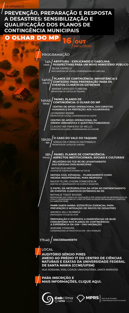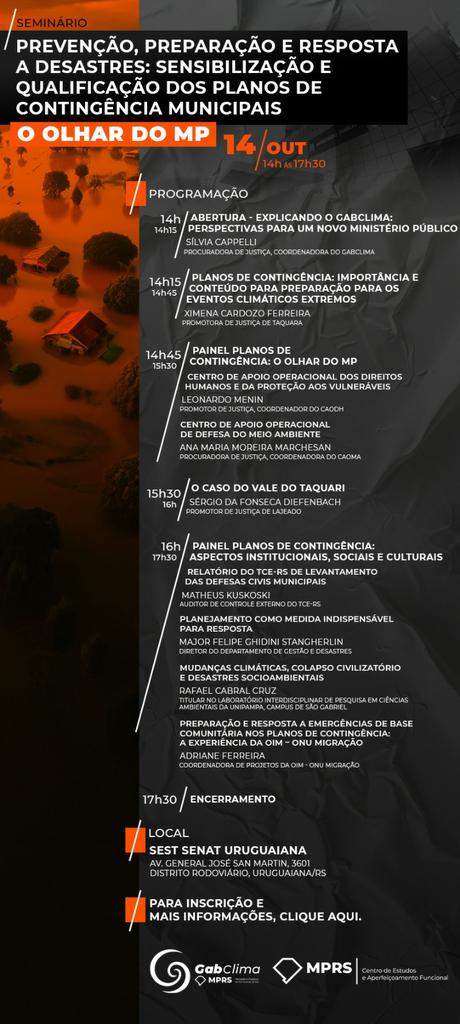 O Ministério Público do Rio Grande do Sul (MPRS), por meio do Gabinete de Estudos Climáticos (GabClima), promove, na próxima semana, os dois primeiros seminários no Interior do Estado com o tema “Prevenção, Preparação e Resposta a Desastres: Sensibilização e Qualificação dos Planos de Contingência Municipais – O Olhar do MP”. Os encontros, que acontecerão em Uruguaiana no dia 14 de outubro e Santa Maria, no dia 16, têm como objetivo qualificar gestores públicos e demais interessados para enfrentar os desafios impostos pelos eventos climáticos extremos, com foco na elaboração e aprimoramento dos planos de contingência municipais.