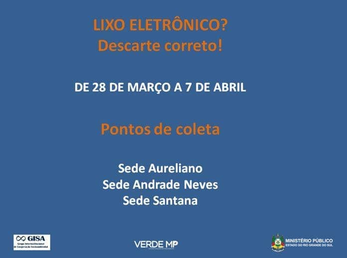 O Ministério Público, juntamente com as demais 15 instituições que compõem o Grupo Interinstitucional de Cooperação Socioambiental – Gisa, está participando, de 21 a 30 de outubro, da Semana Lixo Zero, voltada à coleta de resíduos eletrônicos. O evento propõe a discussão sobre a gestão de resíduos sólidos e o conceito Lixo Zero em diversos segmentos da sociedade. No MP haverá pontos de coleta dos equipamentos eletrônicos na recepção das sedes Institucional, Andrade Neves; Santana e Ceaf....