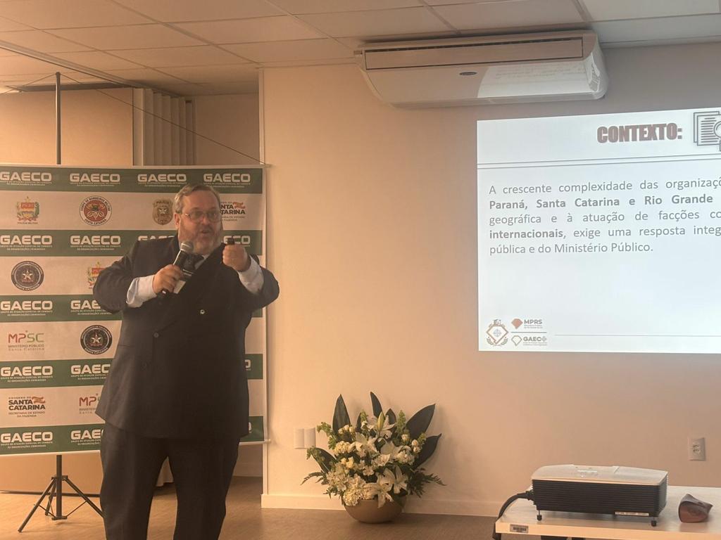 O Grupo de Atuação Especial de Combate ao Crime Organizado do Ministério Público do Rio Grande do Sul (GAECO/MPRS) participou nesta quinta-feira, 6 de novembro, em Florianópolis, do 1º Seminário dos Ministérios Públicos Estaduais da Região Sul. O evento reuniu procuradores de Justiça, promotores, servidores e policiais adidos aos MPs do RS, Santa Catarina e Paraná. O objetivo foi fortalecer a atuação conjunta no enfrentamento às organizações criminosas dos três Estados.