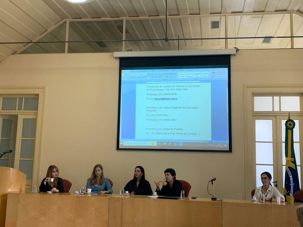 Participaram da atividade as promotoras de Justiça Maria Augusta Menz, Daniele da Silva Pires, Luciana Moraes Dias, Carla Cabral Lena Souto e Cinara Vianna Dutra Braga, além de representantes do Conselho Tutelar, do Centro de Referência Especializado de Assistência Social (CREAS) e da Secretaria Municipal da Educação.