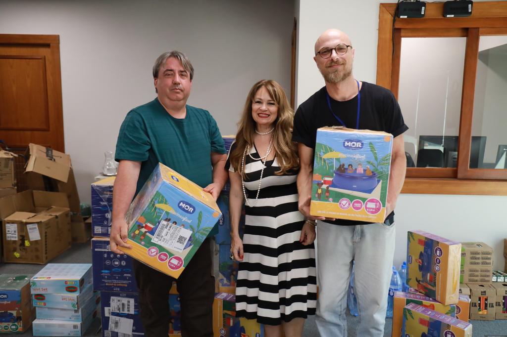 Na sequência, foram entregues 33 piscinas plásticas às instituições, adquiridas com recursos provenientes de doações de promotores e procuradores do MPRS. Outras nove piscinas serão entregues nos próximos dias. As casas de acolhimento também receberam livros da autora Denise Weinréb. A promotora de Justiça Cinara Vianna Dutra Braga, que articulou as doações, destacou a importância da solidariedade para garantir bem-estar e lazer às crianças e adolescentes acolhidos.