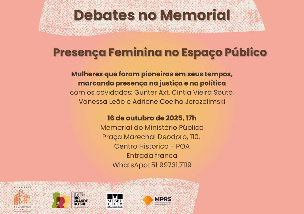O Memorial do Ministério Público do Rio Grande do Sul (MPRS) promove, na próxima quinta-feira, 16 de outubro, às 17h, mais uma edição da série Debates no Memorial, intitulada “Presença Feminina no Espaço Público”. O evento contará com a participação do coordenador técnico do Memorial do MPRS, Gunter Axt, da historiadora Cíntia Vieira Souto, da museóloga Vanessa Leão e da pedagoga Adriene Coelho Jerozolimski. O debate acompanha a exposição homônima, resultado de parceria do MPRS com o Muse...