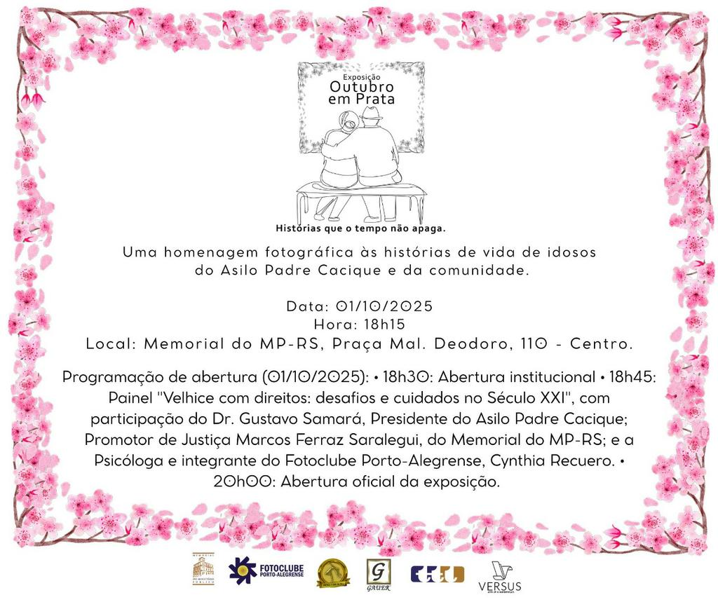 O Memorial do Ministério Público do Rio Grande do Sul (MPRS), o Fotoclube Porto-Alegrense e o Asilo Padre Cacique promovem, a partir da próxima quarta-feira, 1º de outubro, a exposição "Outubro em prata: Histórias que o tempo não apaga". A abertura oficial ocorre às 18h15, no Memorial do MP (Praça Mal. Deodoro, 110), em Porto Alegre, com entrada gratuita. A mostra integra as comemorações do Mês do Idoso e permanece em cartaz até 31 de outubro.