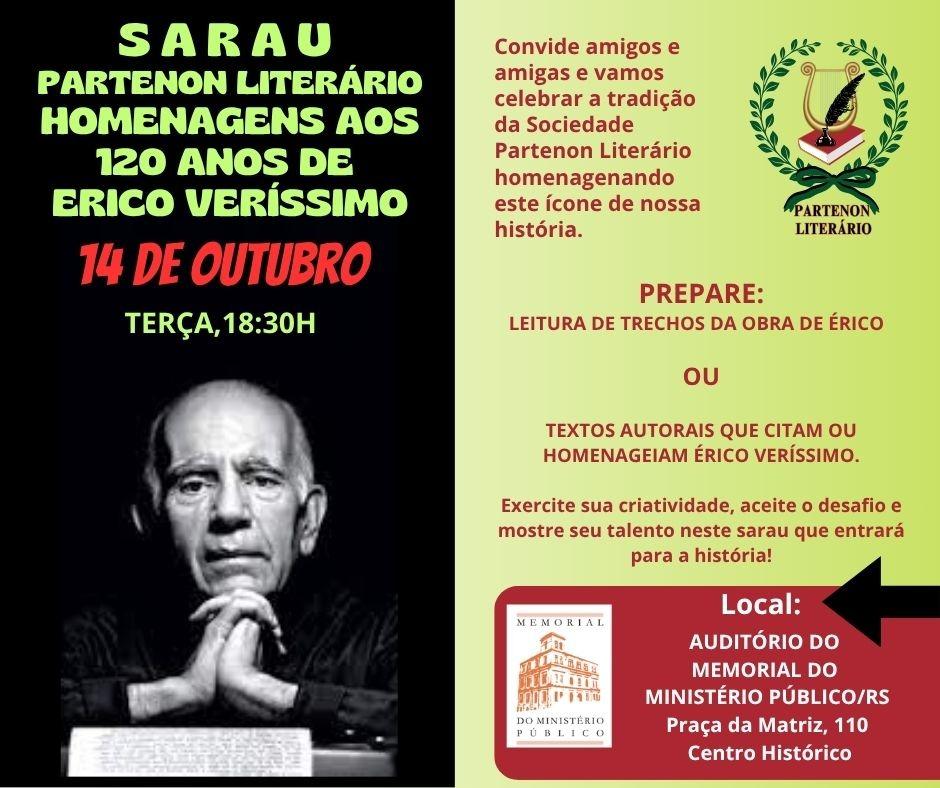 O Memorial do Ministério Público do Rio Grande do Sul será sede, na próxima terça-feira, 14 de outubro, de um sarau festivo em comemoração aos 120 anos do escritor Erico Verissimo. O evento é promovido pela Sociedade Partenon Literário, uma das mais antigas agremiações literárias e artísticas do Estado.