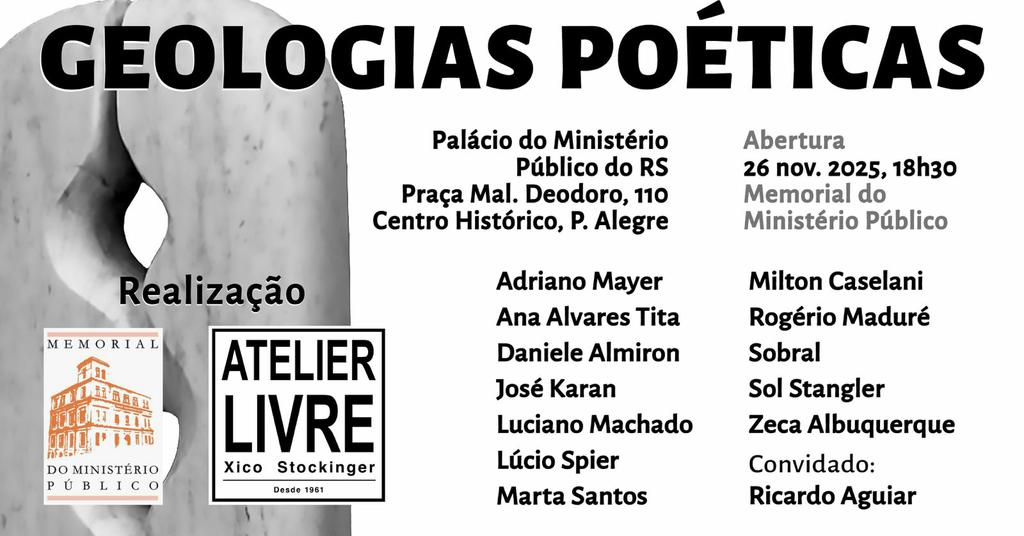 O Memorial do Ministério Público do Rio Grande do Sul (MPRS) recebe, a partir desta quarta-feira, 26 de novembro, a exposição “Geologias Poéticas”, com obras produzidas na Oficina de Escultura em Pedra do Atelier Livre Xico Stockinger. A abertura acontece às 19h, no Palácio do Ministério Público (Praça Marechal Deodoro, 110), no Centro Histórico de Porto Alegre.